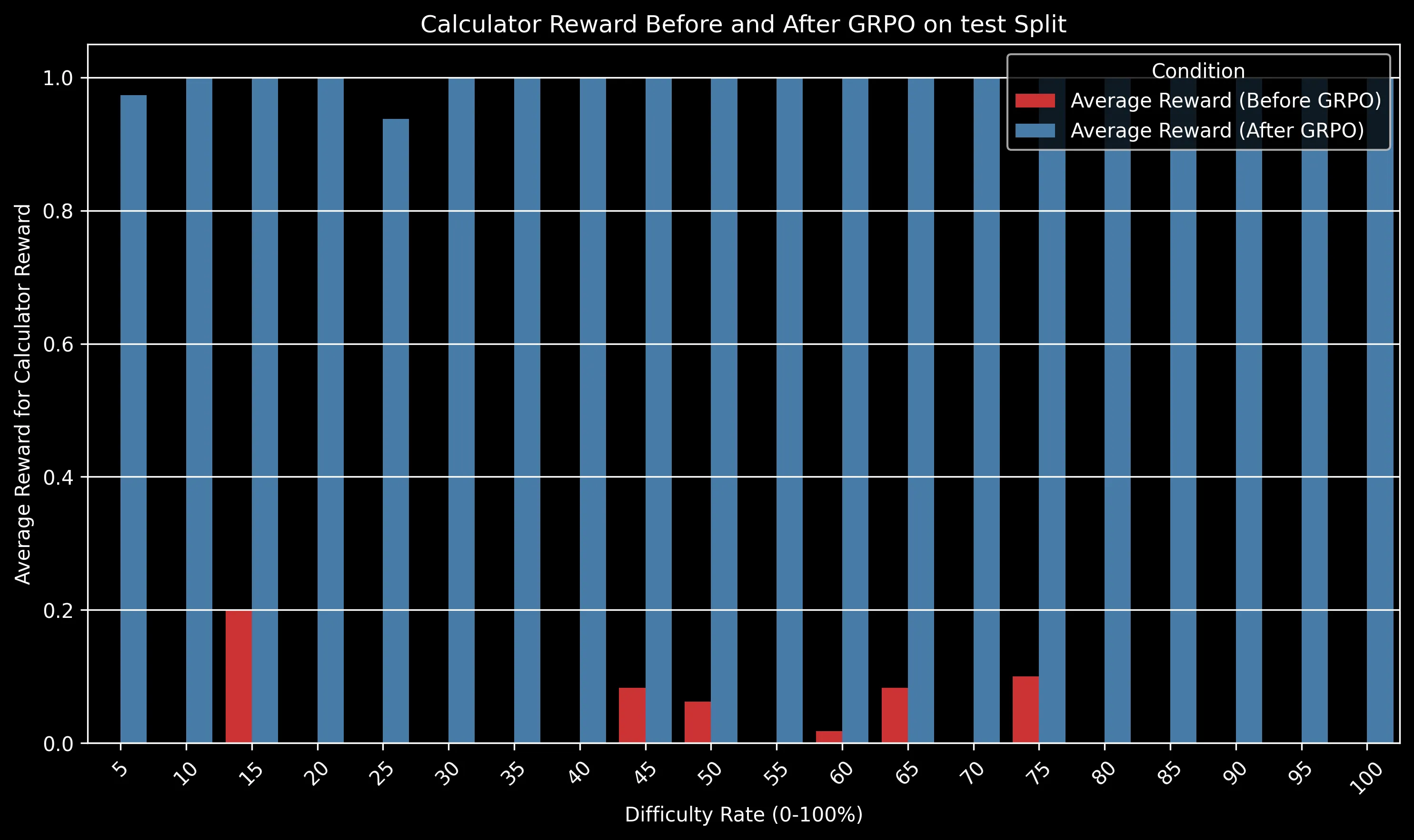 Tool Usage: The GRPO model demonstrates effective tool use by calculating 4² using the calculator tool, showing it has learned to leverage available tools.