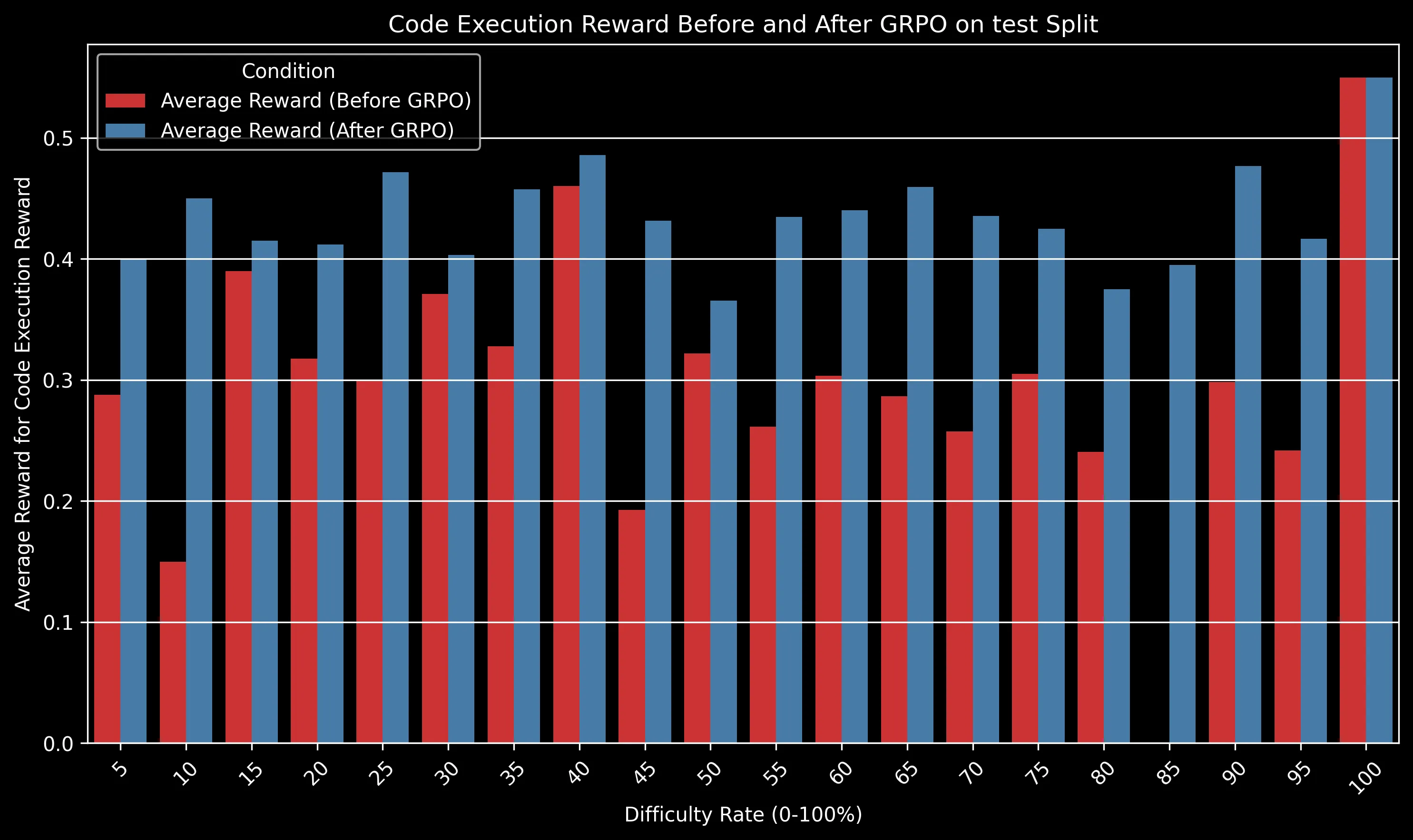 code_execution_reward_func: Rewards successful code execution without errors (weighted at 0.5)code_performance_reward_func: Evaluates runtime efficiency and memory usage (weighted at 0.25)