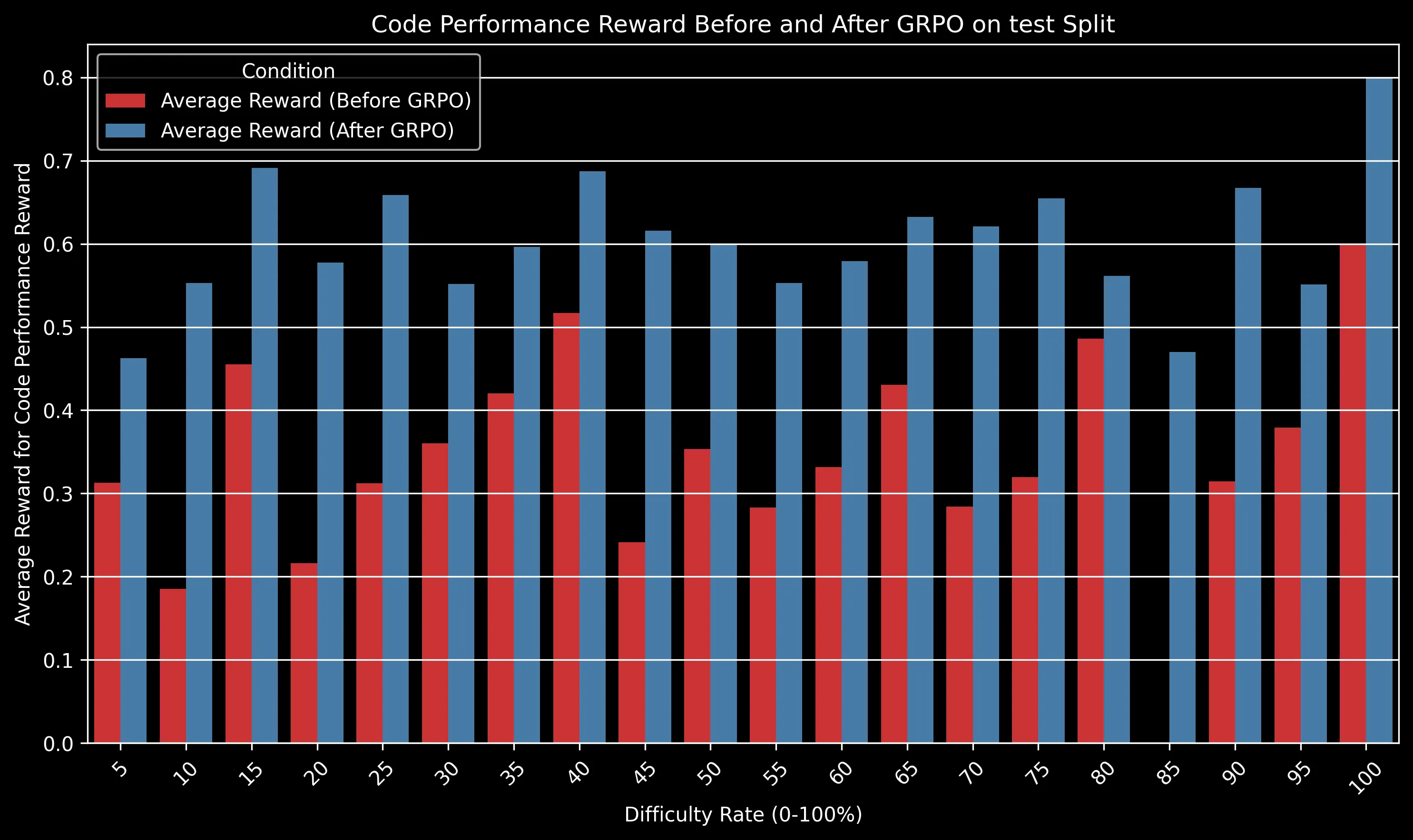 What makes our approach unique is its ability to convert general-purpose chat models into specialized reasoning agents without architecture changes—simply through reinforcement learning with carefully designed reward functions that emphasize both correctness and efficiency. The results demonstrate how execution-based feedback can bridge the gap between academic benchmarks and practical algorithmic problem-solving capabilities that programmers need in real-world scenarios.